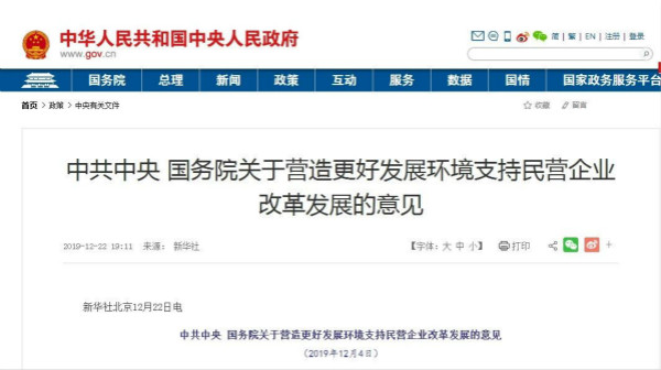 12月22日,《中共中央 國務院關于營造更好發(fā)展環(huán)境支持民營企業(yè)改革發(fā)展的意見》(以下簡稱《意見》)公布,為進一步激發(fā)民營企業(yè)活力和創(chuàng)造力、促進民營經濟發(fā)展,圍繞營造市場化、法治化、制度化的長期穩(wěn)定發(fā)展環(huán)境作出一系列安排部署。